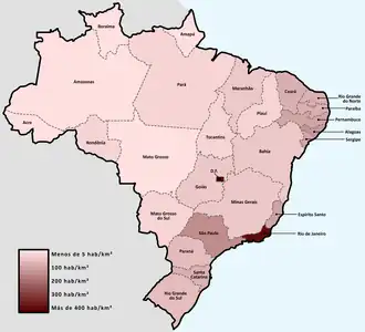 Brasil tiene una baja densidad de población, de 25 habitantes por km², por debajo de la media del planeta y mucho menor que otros países de similar población, como Japón (337 habitantes por km²). La distribución de la población en Brasil es muy desigual, con una concentración en las zonas costeras, especialmente en el sudeste y el noreste del país. Otro núcleo importante es la región de los estados del sur. Las zonas menos pobladas se encuentran en el Centro-Oeste y en el Norte.