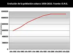 La República de Cuba tiene una población de 11 167 325 habitantes en 2012, según la Oficina Nacional de Estadística e Información (ONEI), organismo estatal encargado de llevar los datos demográficos cubanos.[2] Se trata del país más poblado del Caribe insular; sin embargo, su densidad de población (101.6 hab/km² según ONEI 2012) es menor que la de Haití, República Dominicana o Puerto Rico.[3] Se observan elevados indicadores sociales con respecto a los demás países de Iberoamérica, como la esperanza de vida, el índice de alfabetización y baja mortalidad infantil,[4] pobreza,[5] pobreza extrema y desempleo.[3] Ocupa la posición 64 entre los 178 países evaluados por el índice de desempeño ambiental[6] y la posición 72 de 189 países en el índice de desarrollo humano en 2019.[7]