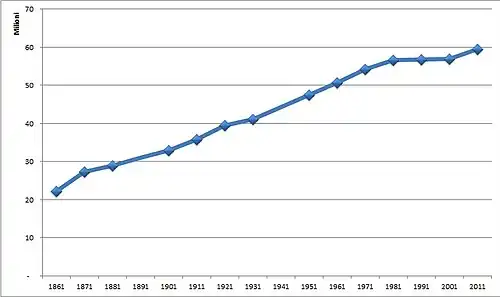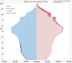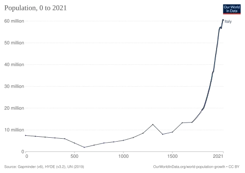 Según los datos del ISTAT (Istituto Nazionale di Statistica), Italia contaba con 58 915 797 habitantes en mayo de 2025.[2] Italia, con una densidad de 195,5 hab./km² aproximadamente, posee la quinta mayor densidad poblacional en Europa.