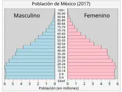 En 2020, la población de México era de 126,014,024 habitantes,[4] la mayor entre los países de habla hispana. A lo largo del siglo XX la población mexicana pasó de 13.6 a 129.5 millones de habitantes al crecer a tasas en torno al 3% anual entre 1940 y 1990. Este ritmo de crecimiento, generalizado en los países en desarrollo en ese periodo, fue calificado de transición demográfica y motivó la adopción de una política de control de la natalidad a partir de los años setenta.
