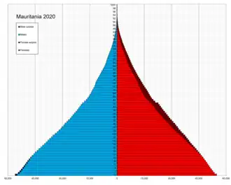 Según la revisión de 2019 de World Population Prospects, la población total de Mauritania era de 4 403 313 personas en 2018, en comparación con solo 657 000 ciudadanos en 1950. La proporción de niños menores de 15 años en 2010 era 39,9 %, 57,4 % tenía entre 15 y 65 años, mientras que el 2,7 tenía 65 años o más.[1]