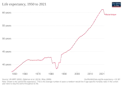 Mozambique pose altas tasas de fecundidad, una población joven en rápido crecimiento: el 45% de la población es menor de 15 años. La elevada tasa de pobreza de Mozambique se debe a las catástrofes naturales, las enfermedades, el elevado crecimiento demográfico se debe a la tasa de natalidad del país es una de las más altas del mundo, con una media de más de 5 hijos por mujer (y mayor en las zonas rurales) durante al menos las tres últimas décadas. El alto nivel de fecundidad sostenido refleja la desigualdad de género. La elevada tasa de crecimiento de la población se ve algo frenada por las altas tasas de VIH/SIDA y de mortalidad general del país. Mozambique se encuentra entre los peores del mundo en cuanto a prevalencia del VIH/SIDA, muertes por VIH/SIDA y esperanza de vida al nacer.[cita requerida]Desde el final de la guerra civil, su calidad de vida ha mejorado notablemente.