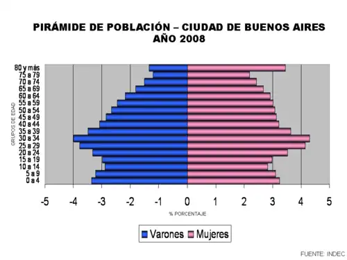 La estructura poblacional estimada para 2008 mostraba que el porcentaje de habitantes entre 0 a 14 años (16,35%) es casi similar al de habitantes de 65 años o más (16,40%). La tasa de personas de 60 años o más es del 21,67%.[6] Todas estas cifras indican que la ciudad de Buenos Aires es la segunda jurisdicción más envejecida de la Argentina, solo superada por la ciudad de Vicente López, que tiene un 23% de personas mayores de 60 años.(INDEC 2010)
