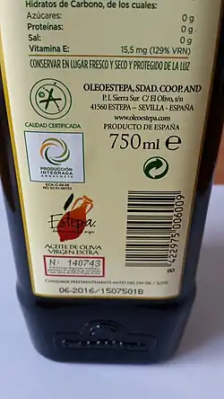 Etiqueta de la DO Estepa en la parte trasera de una botella de aceite de oliva