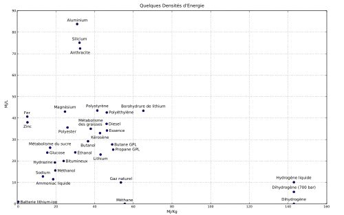 Las fuentes de energía de más alta densidad provienen de reacciones de fusión y de fisión, teniendo la fusión sólo cuatro veces más rendimiento que la fisión (del orden de un terajulio por varios gramos).[2] En razón de los límites generados, la fisión se restringe a aplicaciones muy precisas, mientras que la fusión en continuo no ha sido dominada. El carbón, el gas y el petróleo son las fuentes de energía más utilizadas mundialmente, aún si tienen una densidad de energía mucho más débil (alrededor de 50 megajulios por kilogramo; v. gráfico); el resto se debe a la combustión de la biomasa, que tiene una densidad de energía todavía menor.