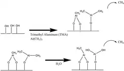 La síntesis de Al2O3 a partir de trimetilaluminio (TMA) y agua es uno de los ejemplos de ALD térmico más conocidos. Durante la exposición al TMA, el TMA se quimisorbe disociativamente en la superficie del sustrato y el TMA restante se bombea fuera de la cámara. La quimisorción disociativa del TMA deja una superficie cubierta de AlCH3. A continuación, la superficie se expone a vapor de H2O, que reacciona con el -CH3 superficial formando CH4 como subproducto de la reacción y dando lugar a una superficie de Al2O3 hidroxilada.[1]