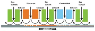En la ALD temporal, las dosis separadas de precursor y co-reactivo se separan en el tiempo mediante un paso de purga. En cambio, en el ALD espacial (s-ALD), estos gases se suministran en lugares diferentes, por lo que están separados en el espacio. En la s-ALD a presión atmosférica, el precursor y el co-reactivo se suministran de forma continua y están separados entre sí por una cortina de gas para evitar reacciones en fase gaseosa. Dicha cortina de gas suele consistir en posiciones de inyección y escape de nitrógeno (véase la figura 1). A medida que un sustrato se desplaza por las distintas zonas de gas, se producen reacciones autolimitadas en la superficie del sustrato y tiene lugar el proceso de ALD. Dado que este proceso puede acelerarse fácilmente, la tasa de deposición para ALD espacial puede ser mucho mayor que para ALD convencional. Por ejemplo, para el ALD de Al2O3, la velocidad de deposición pasa de 100-300 nm por hora a 60 nm por minuto.[5]