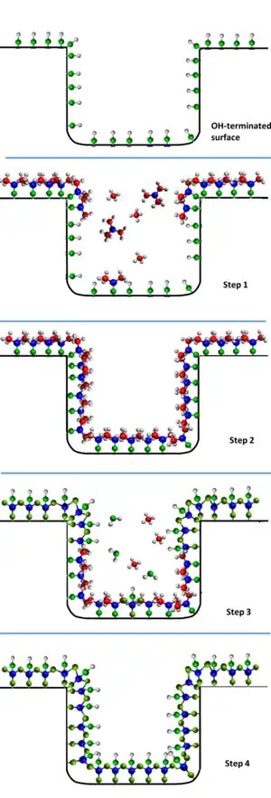 | ALD mejorada por plasma o radicales para materiales ALD de un solo elemento | 20–800 °C[12][31] | Metales puros (por ej. Ta, Ti, Si, Ge, Ru, Pt), nitruros metálicos, (por ej. TiN, TaN, etc.)[12] | Organometálicos, MH2Cl2, terbutilimidotris(dietilamido)tántalo (TBTDET), bis(etilciclopentadienil)rutenio), NH3[12] | Estructuras DRAM, dispositivos MOSFET y semiconductores, condensadores[32] |