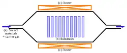 - CVD de alambre caliente (HWCVD) - también conocida como CVD catalizador (Cat-CVD) o CVD de filamento caliente (HFCVD). Utiliza un filamento caliente para descomponer químicamente los gases primarios.[3]