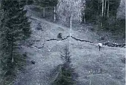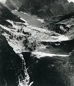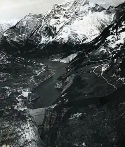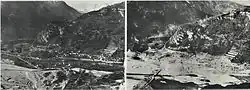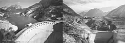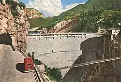 ![]() La presa del Vajont, vista desde el pueblo de Longarone en 2005, muestra aproximadamente los 60-70 metros superiores de hormigón. El muro de agua que superó la presa en 250 metros y destruyó esta aldea y todas las aldeas cercanas el 9 de octubre de 1963 habría oscurecido prácticamente todo el cielo azul en esta foto. | ||