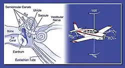 Además, el oído interno contiene acelerómetros rotacionales, conocidos como canales semicirculares, que proporcionan información al cerebro inferior sobre las aceleraciones rotacionales en los ejes de cabeceo, balanceo y guiñada. Los cambios en la velocidad angular se detectan a partir del movimiento relativo entre el fluido en los canales y el canal mismo, que está fijado a la cabeza; debido a la inercia, el fluido en los canales tiende a retrasarse cuando la cabeza se mueve, lo que indica una aceleración rotacional. Sin embargo, la salida del canal semicircular cesa después de una rotación prolongada (más allá de 15–20 segundos) ya que el fluido ahora ha sido arrastrado al movimiento a través de la fricción, coincidiendo con el movimiento de la cabeza. Si se detiene la rotación, la señal de movimiento percibida del oído interno indica que el piloto ahora está girando en la dirección opuesta al viaje real, ya que el fluido continúa moviéndose mientras el canal se ha detenido.[7] Además, la inercia del fluido significa que el umbral de detección de la aceleración rotacional está limitado a aproximadamente 2°/s 2; las aceleraciones angulares por debajo de este valor no se pueden detectar.[1]: 5 Las ilusiones somatogirales comunes específicas inducidas por los canales semicirculares son las inclinaciones, el giro del cementerio, la espiral del cementerio y Coriolis.