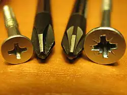 El destornillador Robertson, también conocido como cuadrado,[15] o Scrulox[16] tiene un casquillo en forma de cuadrado en la cabeza del tornillo y una protuberancia cuadrada en la herramienta. Tanto la herramienta como el casquillo tienen una forma cónica, lo que facilita la inserción de la herramienta y también tiende a ayudar a mantener el tornillo en la punta de la herramienta sin que el usuario necesite sujetarlo allí. (La primera razón de ser del cono fue hacer que la fabricación de los tornillos fuera práctica utilizando formado en frío de las cabezas,[17] pero sus otras ventajas ayudaron a popularizar la unidad). Los tornillos Robertson son comunes en Canadá, aunque se han utilizado en otros lugares,[18] y se han vuelto mucho más comunes en otros países en las últimas décadas. Los destornilladores Robertson son fáciles de usar con una sola mano, porque el casquillo cónico tiende a retener el tornillo, incluso si se sacude.[18] También permiten el uso de destornilladores en ángulo y tornillos de cabeza recortada. Los tornillos Robertson de cabeza hueca son autocentrantes, reducen la leva, detienen una herramienta eléctrica cuando se ajustan y se pueden quitar si están pintados o viejos y oxidados.[18] En la industria, aceleran la producción y reducen el daño del producto. Uno de sus primeros usos industriales importantes fue la producción del Modelo A y el Modelo T de Ford Motor Company. Henry Ford los encontró altamente confiables y ahorró un tiempo de producción considerable, pero no pudo obtener una licencia para ellos en los Estados Unidos, por lo que limitó su uso únicamente a su división canadiense. Los destornilladores de cabeza Robertson están disponibles en una gama estándar de tamaños de punta, desde 1,77 mm hasta 4,85 mm.