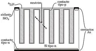 Hay dos tipos básicos de detectores de neutrones semiconductores: los primeros son dispositivos electrónicos recubiertos con un material reactivo a los neutrones y el segundo es un semiconductor compuesto parcialmente de material reactivo a los neutrones.[31] La más exitosa de estas configuraciones es el tipo de dispositivo recubierto, y un ejemplo sería un diodo de Si plano común recubierto con 10B o 6LiF.[32][33] Este tipo de detector fue propuesto por primera vez por Babcock et al.[34] El concepto es sencillo. Un neutrón es absorbido en la película reactiva y emite espontáneamente productos de reacción energéticos. Un producto de reacción puede alcanzar la superficie del semiconductor y, al entrar en el semiconductor, produce pares electrón-hueco. Bajo un voltaje de polarización inversa, estos electrones y huecos son arrastrados a través del diodo para producir una corriente inducida, generalmente integrada en modo de pulso para formar una salida de voltaje. La eficiencia intrínseca máxima para dispositivos con una sola capa es aproximadamente del 5 % para neutrones térmicos (0,0259 eV), y el diseño y el funcionamiento se describen detalladamente en la literatura.[35] La limitación de la eficiencia de detección de neutrones es consecuencia de la autoabsorción del producto de reacción. Por ejemplo, el rango en una película de boro de partículas α de 1,47 MeV de la reacción 10B(n,α) 7Li es de aproximadamente 4,5 micrones, y el rango en LiF de iones de tritio de 2,7 MeV de la reacción 10B(n,α) 7Li es de aproximadamente 28 micrones. Los productos de reacción que se originan a distancias más alejadas de la interfaz película/semiconductor no pueden alcanzar la superficie del semiconductor y, en consecuencia, no contribuirán a la detección de neutrones. También se han explorado dispositivos recubiertos con Gd natural, principalmente debido a su gran sección transversal microscópica de neutrones térmicos de 49.000 barns.[36][37] Sin embargo, los productos de interés de la reacción Gd(n,γ) son principalmente electrones de baja conversión de energía, en su mayoría agrupados alrededor de los 70 keV. En consecuencia, la discriminación entre eventos inducidos por neutrones y por rayos gamma (que producen principalmente electrones dispersos Compton) es difícil para los diodos semiconductores recubiertos de Gd. Un diseño de píxeles compensados buscó remediar el problema.[38] En general, se prefieren los dispositivos recubiertos con 10B o 6LiF, principalmente porque los productos de reacción de partículas cargadas energéticas son mucho más fáciles de discriminar de las radiaciones de fondo.