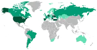 El número de búlgaros fuera de Bulgaria ha aumentado considerablemente desde 1989, tras las revoluciones de 1989 en Europa central y oriental . Más de un millón de búlgaros han abandonado el país, ya sea de forma permanente o como mano de obra temporal, lo que ha provocado una marcada disminución de su población. Muchos aprovecharon el sistema de lotería de tarjetas verdes de EE. UU. Además, muchos búlgaros emigraron a Canadá aprovechando el sistema de puntos de inmigración canadiense para trabajadores calificados . Otros atravesaron la Unión Europea . En países como Alemania y España, muchos búlgaros trabajan y permanecen allí de forma intermitente, manteniendo Bulgaria como residencia permanente. Esta tendencia aumentó tras la ampliación de la Unión Europea en 2007, cuando Bulgaria se convirtió en estado miembro de la Unión Europea .