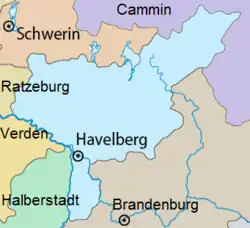 - ↑ El acta de fundación de la diócesis (Monumenta Germaniae Historica, Diplomata, Die Urkunden der deutschen Könige und Kaiser, vol. I, p. 155, nº 76) es una falsificación, quizá del siglo XII, por lo que la fecha de la erección de la diócesis es incierta, aunque ocurrió durante el reinado de Otón I (936-973). Walter Schlesinger, Bemerkungen zu der sogen. Stiftungsurkunde des Bistums Havelberg von 946 Mai 9, en: Jahrbücher für die Geschichte Mittel- und Ostdeutschland. Band 5. 1956. S. 1-48; wieder in: Ders. (Hrsg.): Mitteldeutsche Beiträge zur deutschen Verfassungsgeschichte des Mittelalters. Göttingen 1961. S. 413–464.