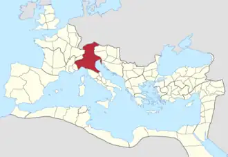 Sobre el año 298 se dividió la Dioecesis Italiae en dos partes: «Italia Anonaria» —que agrupaba las provincias del norte— e «Italia Suburbicaria» —que lo hacía con las del centro y sur—.[4] Ambas, junto a las de Hispania y África, se asignaron a Maximiano. En el año 303, este abdicó junto a Diocleciano de su puesto de augusto y el territorio de Italia fue asignado a Severo. Al poco tiempo cayó bajo el control de Majencio quien fue derrotado por Constantino tras una guerra civil. A la muerte de este, el Imperio se dividió entre sus hijos y Constante recibió las diócesis italianas, las ilíricas y África.[5]