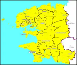 L. Duchesne[2] y H. Waquet[3] y H. Waquet[3] plantean la hipótesis de que la diócesis de Cornualles es la continuación de la diócesis de los coriosolites, cuya civitas en la Galia Lugdunense III (hoy Corseul) está atestiguada por la Notitia Galliarum de principios del siglo V.[4] Según estos autores, los obispos que estuvieron presentes, pero sin indicar su sede, en los concilios de Angers en 453[nota 2] y de Vannes en torno a 465[nota 3] podrían pertenecer a esta antigua diócesis. En estos concilios estuvieron presentes los obispos de la provincia eclesiástica de la arquidiócesis de Tours, a la que pertenecían tanto la civitas Coriosolitum como la diócesis de Cornualles.