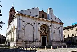 En 1809 el Templo Malatesta se convirtió en la nueva sede de la Catedral de Santa Colomba. La antigua catedral, originalmente dedicada quizás al Espíritu Santo en forma de paloma, fue construida cerca de las murallas romanas en lo que hoy es Piazza Malatesta[3] y, con su consagración como catedral (1154), también fue dedicada a santa Colomba de Sens. Fue derribado en 1815.