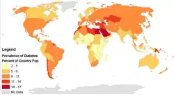 En 2017, 425 millones de personas tenían diabetes en todo el mundo,[38]​ frente a un estimado de 382 millones de personas en 2013[39]​ y de 108 millones en 1980.[40]​ Teniendo en cuenta la estructura cambiante por edades de la población mundial, la prevalencia de diabetes es del 8,8 % entre los adultos, casi el doble de la tasa del 4,7 % en 1980.[38][40]​ El tipo 2 representa aproximadamente el 90 % de los casos.[41][42]​ Algunos datos indican que las tasas son aproximadamente iguales en mujeres y hombres,[43]​ pero se ha encontrado un exceso de diabetes en varones en muchas poblaciones con mayor incidencia de tipo 2, posiblemente debido a diferencias relacionadas con el sexo en la sensibilidad a la insulina, las consecuencias de la obesidad y la deposición de grasa corporal regional, y otros factores contribuyentes como la presión arterial alta, el tabaquismo y la ingesta de alcohol.[44][45]