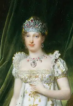 La tradición dictaba que una novia real que llegaba a Francia no debía conservar nada de su tierra natal, especialmente su ropa. En consecuencia, cuando María Luisa de Austria llegó a Francia para casarse con el emperador Napoleón, fue despojada de su vestido, corsé, medias y camisola, dejándola completamente desnuda. Paulina Bonaparte, la hermana de Napoleón, hizo que la adolescente desnuda se bañara. Luego la vistieron nuevamente solo con la ropa y las joyas que le compró su nuevo esposo.[2] Por lo tanto, sin joyas propias, María Luisa necesitaba un conjunto nuevo completo para ella. Entre estas joyas había un par de parures, una de diamantes y ópalos, otra de diamantes y esmeraldas. A este último conjunto pertenecía la diadema que más tarde se llamaría de María Luisa. Ambos aderezos fueron entregados a María Luisa para que los conservara como parte de su colección personal. Por ello, cuando abandonó París y se fue a Viena tras el exilio de Napoleón, se llevó consigo la diadema y las piezas de joyería asociadas, dejando las joyas de la corona en la capital austríaca.