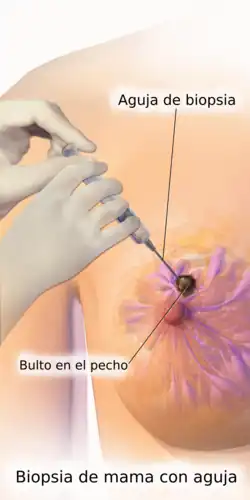 La biopsia permite realizar un diagnóstico definitivo de cáncer de mama. Para realizar la biopsia, se utiliza una aguja especial guiada por radiografía u otra técnica de diagnóstico por imágenes para extraer una porción muy pequeña de tejido de la zona sospechosa. A menudo el especialista coloca un pequeño marcador metálico dentro de la mama para poder identificar la zona más fácilmente en futuras pruebas de diagnóstico por imágenes.