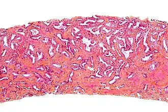 ![]() Micrografía de próstata que muestra una biopsia de próstata adenocarcinoma, el tipo acinar, el tipo más común de cáncer de próstata. | ||