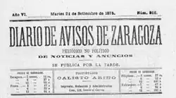 Existieron en Zaragoza diferentes diarios de avisos en la época,[1] pero es este, fundado por Calixto Ariño en 1870, el que se considera el diario de avisos zaragozano por excelencia.[2] El primer número del Diario de Avisos de Zaragoza vio la luz el 27 de septiembre de 1870 y se publicó por última vez el 27 de diciembre de 1937.[3]
