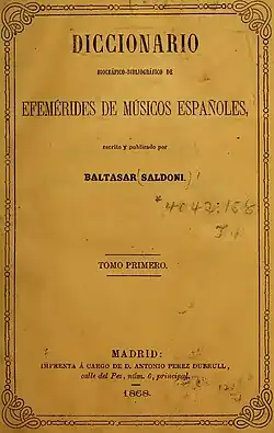 - Saldoni, Baltasar (1868). Diccionario biográfico-bibliográfico de efemérides de músicos españoles I. Madrid: Imprenta de Antonio Pérez Dubrull. Wikidata Q114876294.