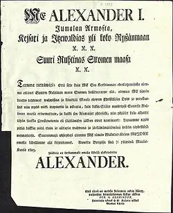 - ↑ La declaración del zar en la Dieta de Porvoo, de acuerdo a su traducción oficial al finés, reeditada por Kustavi Grotenfelt (1861-1928): Suomenkielisiä historiallisia asiakirjoja Ruotsin vallan ajalta (vuosilta 1548-1809), Helsinki 1912; en Wikisource: Julistus Suomen entisen uskonnon ja perustuslakien vahvistamisesta.