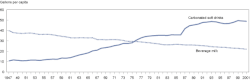 De 1971 a 2000, la media diaria de calorías que consumían las mujeres en Estados Unidos aumentó en 335 calorías al día (1542 calorías en 1971 y 1877 calorías en 2000). En el caso de los hombres, el aumento medio fue de 168 calorías al día (2450 calorías en 1971 y 2618 calorías en 2000). La mayoría de estas calorías adicionales procedían de un aumento del consumo de hidratos de carbono, aunque también se produjo un aumento del consumo de grasas durante el mismo periodo de tiempo.[6] El aumento del consumo de calorías se atribuye principalmente al «consumo de comida fuera de casa; al aumento del consumo de energía procedente de aperitivos salados, refrescos y pizza; y al aumento del tamaño de las porciones».[6] Otras fuentes señalan que el consumo de refrescos y otras bebidas azucaradas representa actualmente casi el 25% de las calorías diarias de los adultos jóvenes estadounidenses.[7] Dado que estas estimaciones se basan en lo que las personas recuerdan haber consumido, por ello, puede que se subestime la verdadera cantidad de calorías consumidas.[6]