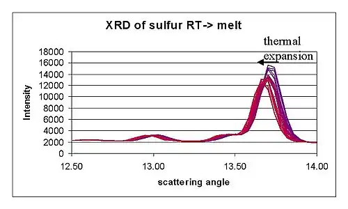 En algunas condiciones críticas, por ejemplo 0 °C para el agua a 1 atm, una nueva disposición de átomos o moléculas puede volverse estable, dando lugar a una transición de fase. En este punto aparecerán nuevos picos de difracción o desaparecerán los antiguos según la simetría de la nueva fase. Si el material se funde en un líquido isotrópico, todas las líneas nítidas desaparecerán y serán sustituidas por un amplio patrón amorfo. Si la transición da lugar a otra fase cristalina, un conjunto de líneas será sustituido repentinamente por otro conjunto. En algunos casos, sin embargo, las líneas se dividirán o fusionarán, por ejemplo, si el material experimenta una transición de fase continua de segundo orden. En tales casos, la simetría puede cambiar porque la estructura existente se distorsiona en lugar de ser sustituida por una completamente diferente. Por ejemplo, los picos de difracción para los planos de red (100) y (001) pueden encontrarse en dos valores diferentes de q para una fase tetragonal, pero si la simetría se vuelve cúbica los dos picos llegarán a coincidir.