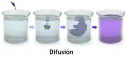 En el enfoque fenomenológico, difusión es el movimiento de una sustancia desde una región de alta concentración a una región de baja concentración sin movimiento en masa. Según las leyes de Fick, el flujo de difusión es proporcional al gradiente negativo de concentraciones. Va de regiones de mayor concentración a regiones de menor concentración. Algún tiempo después, se desarrollaron varias generalizaciones de las leyes de Fick en el marco de la termodinámica y la termodinámica de no equilibrio.[3]