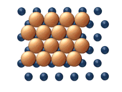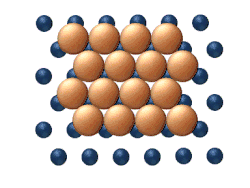 - La difusión química describe el proceso a mayor nivel de cobertura, donde los efectos de atracción o repulsión entre adátomos adquieren importancia. Estas interacciones sirven para alterar la movilidad de los adátomos. De forma burda, la figura 3 sirve para mostrar cómo pueden interactuar los adátomos a niveles de cobertura más altos. Al principio, los adátomos no tienen más "elección" que moverse hacia la derecha, y los adátomos adyacentes pueden bloquear los sitios de adsorción entre sí.