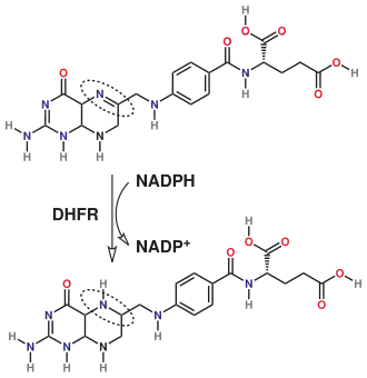 La dihidrofolato reductasa o DHFR es una enzima que reduce el ácido dihidrofólico a ácido tetrahidrofólico, utilizando NADPH como donador de electrones, que puede ser convertido a los diversos cofactores tipo tetrahidrofolato usados en química de transferencia de 1 carbono. En humanos, la enzima DHFR está codificada por el gen dhfr.[1][2][3]