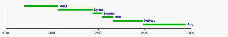 | Necherjet | Dyeser-sa | Dyeser | Dyeser-it | Tosortros | 19 | c. 2682 - 2663 a. C. |