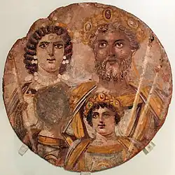 Tondo Severiano. Retrato de la familia imperial: arriba, Julia Domna y Septimio Severo; abajo, Geta, borrado por damnatio memoriae, y Caracalla.