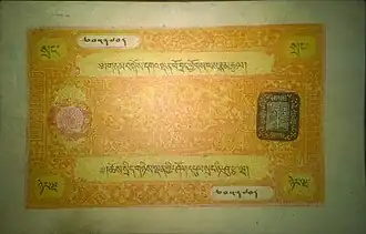 Los billetes tibetanos se emitieron por primera vez en enero de 1913 con las denominaciones de 5 tam (verde o azul) y 10 tam (rojo). Estos fueron fechados en el año 1658 de la era tibetana (que comenzó en 1912 d. C. y terminó a principios de 1913).[19][20] Posteriormente, en 1913 d. C., siguieron otros problemas. Todas estas notas están fechadas en el año 1659 de la era tibetana, que comenzó en febrero de 1913 d. C. Son los siguientes: una nota de 10 tam (rojo), una nota de 15 tam (violeta), una nota de 25 tam (marrón o amarillo) y una nota de 50 tam (azul o violeta). Al igual que los dos números anteriores, llevan un sello rojo que representa la autoridad del Dalai Lama y un sello negro que tiene la siguiente inscripción en escritura tibetana 'phags pa (también llamada "escritura del sello"): gzhung dngul khang, y se puede traducir como "tesorería del gobierno" o "banco del gobierno".[19][20] Las cinco notas tam continuaron imprimiéndose, pero la fecha de estas notas no se cambió, es decir, permaneció TE (Era Tibetana) 1658. Las primeras notas tibetanas estaban impresas en bloques de madera en papel producido localmente y numeradas a mano con tinta negra por calígrafos tibetanos especialmente capacitados. En la década de 1930 se retiraron de la circulación . Llevan la siguiente inscripción en el anverso:[19][20]