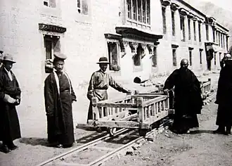 Además, una casa de moneda llamada gser khang ("casa del oro"), ubicada al oeste de Norbulingka, estaba en operaciones en la década de 1920 para la acuñación de monedas de oro y cobre. Una ceca conocida como Mekyi (en tibetano me kyid; abreviatura de me tog skyid po que significa "flores agradables") estaba ubicada en la residencia del Amban chino y quizás fue utilizada por los chinos en 1910 para acuñar monedas sino-tibetanas. Fue asumido por el gobierno tibetano después de la partida forzada del último Amban en 1913, y allí se acuñaron monedas entre 1914 y principios de la década de 1930. Un establecimiento ubicado al sur del (río) Kyichu cerca de Lhasa, conocido como Tip Arsenal, se menciona ocasionalmente como "ceca",[21] aunque no hay evidencia de que allí se acuñaran monedas. Una pequeña fábrica destinada a la producción de piezas en bruto de cobre existía en el valle de Chumbi a medio camino entre Yatung y la frontera entre Tíbet y Sikkim; su nombre era Norbu Tsoki (en tibetano: ni bu mthso dkyil ) y estuvo operativa entre 1923 y 1928.