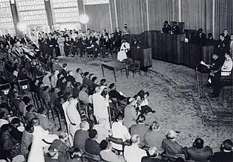 Lumumba, primer ministro congoleño, pronunció el discurso durante las conmemoraciones oficiales de la independencia en el Palacio de la Nación en Léopoldville (la actual Kinshasa). La ceremonia estaba destinada a marcar el final armonioso del gobierno belga y contó con la presencia de dignatarios congoleños y belgas, incluido el rey Balduino. El discurso de Lumumba, que no estaba programado originalmente, fue en gran parte una respuesta al discurso de Balduino que sostenía que el fin del gobierno colonial en el Congo había sido representado como la culminación de la "misión civilizadora" belga iniciada por Leopoldo II en el Estado Libre del Congo.[1][2][3][4]
