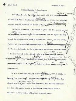 «Ayer, 7 de diciembre de 1941 —una fecha que vivirá en la infamia—los Estados Unidos de América fueron atacado repentina y deliberadamente por fuerzas navales y aéreas del Imperio del Japón». Yesterday, December 7, 1941—a date which will live in infamy—the United States of America was suddenly and deliberately attacked by naval and air forces of the Empire of Japan.