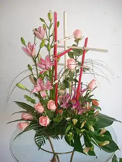 Los diseños florales, arreglos o decoraciones incorporan los elementos del diseño floral:[3] línea, forma, espacio, textura y color y los principios del diseño floral:[3] balance, proporción, ritmo, contraste, armonía y unidad.[4]