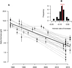 En 2013, la Sociedad Entomológica de Krefeld informó de una "enorme reducción de la biomasa de insectos" atrapados en trampas de mosquitos en 63 reservas naturales de Alemania (57 en Renania del Norte-Westfalia, una en Renania-Palatinado y otra en Brandenburgo).[24] Un nuevo análisis publicado en 2017 sugería que, en 1989-2016, se había producido una "disminución estacional del 76% y a mediados del verano del 82%, en la biomasa de insectos voladores durante los 27 años de estudio". La disminución fue "aparente independientemente del tipo de hábitat" y no pudo ser explicada por "cambios en el clima, el uso de la tierra y las características del hábitat". Los autores sugieren que no sólo las mariposas, las polillas y las abejas silvestres parecen estar en declive, como indicaban estudios anteriores, sino "la comunidad de insectos voladores en su conjunto". Según The Economist, el estudio fue el "tercer estudio científico más citado (de todo tipo) en los medios de comunicación en 2017"; dio lugar a informes de los medios de comunicación sobre el "Armagedón ecológico". El entomólogo británico Simon Leather escribió que los autores del estudio no pudieron relacionar el declive con el cambio climático o los pesticidas, pero sugirieron que se trataba de agricultura intensiva. Si bien está de acuerdo con sus conclusiones, advierte que "los datos se basan en la biomasa, no en las especies, y los hábitats no se muestrean continuamente y no son representativos a nivel mundial".[25][26][27]