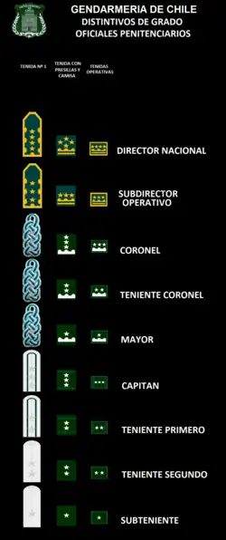 Corresponde a los funcionarios que han cursado y aprobado la malla curricular impartida por la Escuela de Oficiales de Gendarmería para la carrera de oficial penitenciario, excepto el grado de director nacional bajo ciertas circunstancias, ya que es imperativo que se cuente con los requisitos consignados en las normativas institucionales y la confianza del Presidente de la República.[4] La designación del director nacional recae en el jefe de Estado, quedando a su criterio el nombramiento de un oficial penitenciario de línea o un profesional que posea una carrera universitaria de a lo menos ocho semestres de duración, y que acredite una experiencia no inferior a cinco años en el sector público o privado.