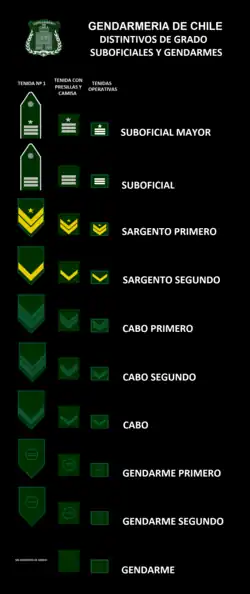| Grado | Suboficial Mayor | Suboficial | Sargento 1° | Sargento 2° | Cabo 1º | Cabo 2º | Cabo | Gendarme 1° | Gendarme 2° | Gendarme | Gendarme Alumno |