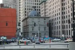 El distrito se centra en la Aduana de los Estados Unidos, una estructura de granito de tres pisos construida en 1857 según un diseño de Ammi B. Young ; fue incluido en el Registro Nacional en 1972. Se construyeron siete edificios en sus inmediaciones entre 1850 y 1920, que albergaron negocios críticos para el funcionamiento de la creciente economía industrial de Rhode Island. Notable entre estos es el edificio del Banco de América del Norte de 1855, un estrecho edificio de piedra rojiza de cuatro pisos diseñado por el destacado arquitecto local Thomas Tefft . El edificio más antiguo del distrito, ahora conocido como Westminster Arcade, fue diseñado por Russell Warren y construido en 1828. Notable por su frente de templo griego, fue declarado Monumento Histórico Nacional en 1976 y fue el primer centro comercial cerrado de la nación. El Equitable Building, construido en 1872, es uno de los primeros edificios de la ciudad en presentar una fachada de hierro fundido.[2]