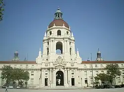 El edificio del palacio municipal de estilo Beaux-Arts y neomediterránea fue diseñado por los arquitectos de San Francisco Bakewell y Brown al estilo del arquitecto italiano del siglo XVI Andrea Palladio. El edificio se parece a tres de las estructuras abovedadas de Palladio: la iglesia de Santa Maria della Salute en Venecia, el Hotel des Invalides en París y la Catedral de San Pablo en Londres. Sin ser una imitación directa, el palacio municipal de Pasadena está relacionado con todos ellos.[2]
