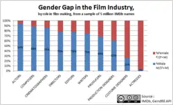 El análisis de Internet Movie Database (IMDb, volcado de datos de 2005) muestra cuán amplia es la brecha de género en la industria cinematográfica, especialmente para los tipos de trabajos más prestigiosos. Hay casi el doble de actores que de actrices en IMDb. Los trabajos prestigiosos como compositor, cinematógrafo y director están dominados por hombres en un 88 %, 76 % y 86 %, respectivamente.[28]