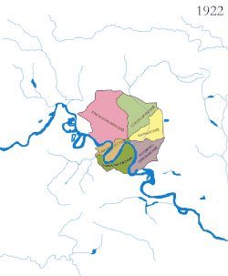 En 1917 Moscú fue dividida en 8 distritos. En octubre de 1917 fue dividida en 11 distritos.