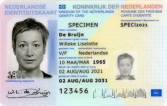 ![]() ![]() Anverso y reverso de ejemplar del documento de identidad neerlandés del tamaño de una tarjeta de crédito emitido desde el 9 de marzo de 2014. | ||