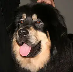El dogo del Tíbet, también conocido como mastín tibetano, es una raza de perro originaria de China. Su pelaje largo de doble capa está sujeto al clima y se encuentra en una amplia variedad de colores, que incluyen negro sólido, negro y fuego, varios tonos de rojo (desde dorado pálido hasta rojo intenso) y gris azulado (negro diluido), y en ocasiones con marcas blancas alrededor del cuello, pecho y patas.[cita requerida]